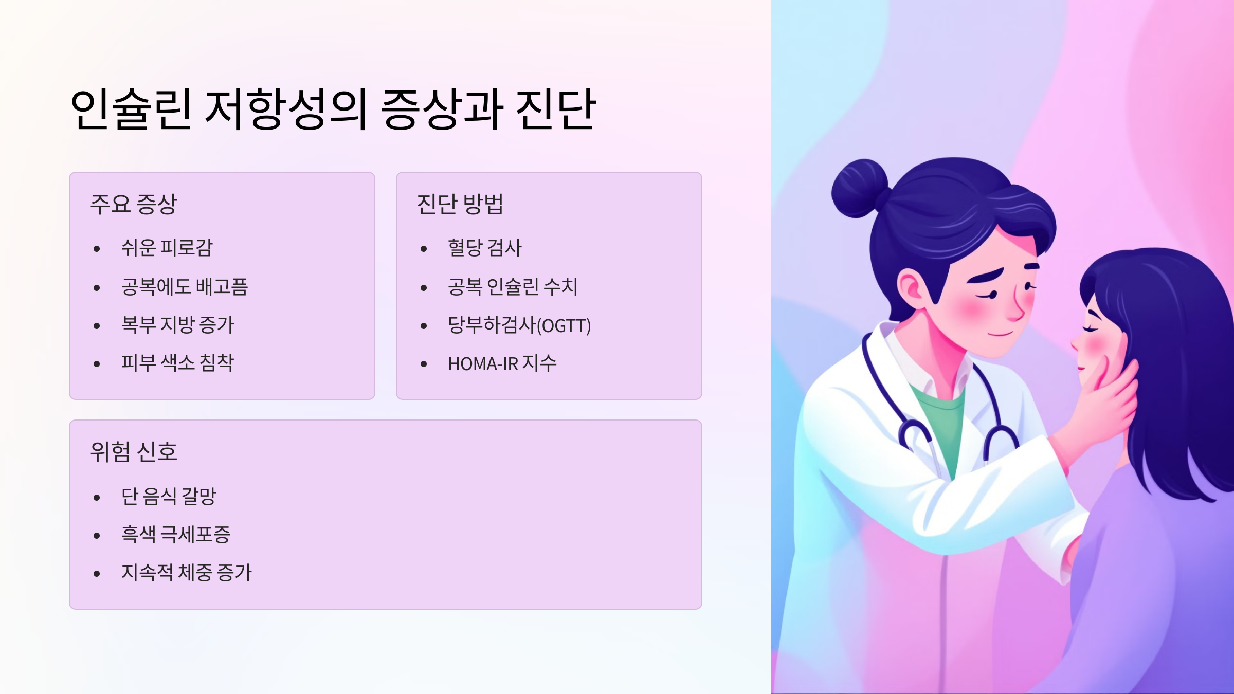 진단을 위해서는 혈당 검사, 공복 인슐린 수치 검사, 당부하검사(OGTT) 등을 시행할 수 있습니다. 특히 인슐린 저항성 지수(HOMA-IR)가 중요한 지표로 사용됩니다.
